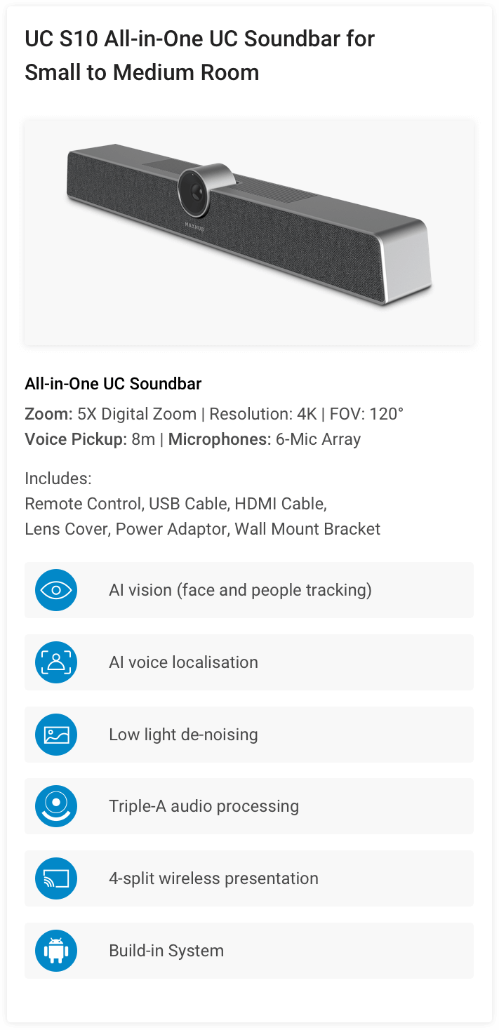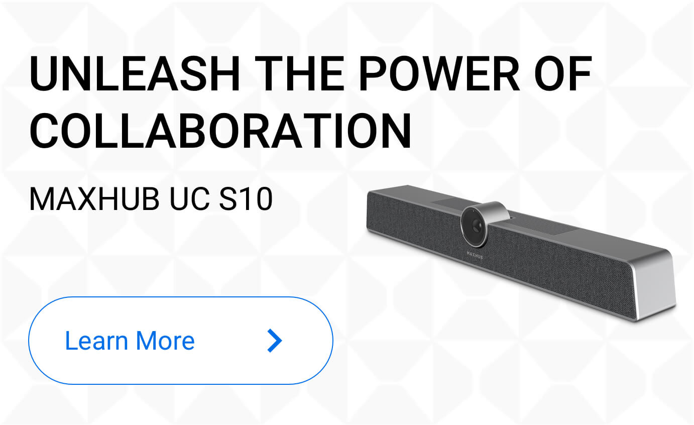 “The MAXHUB UC S10” works as either a connected solution or a standalone one, with great video and audio quality, flawless speaker tracking and support for a wide range of popular cloud video conferencing apps.”,